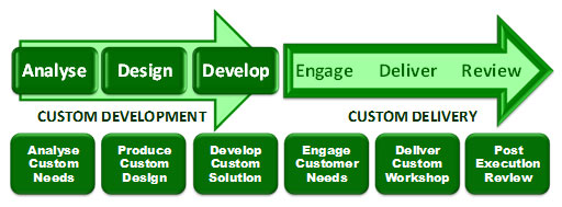 Through an overlay process we will integrate, the knowledge, principles, tools, and techniques required to support a learning outcome related to help your people become more effective. Our approach is to empower the participants to be able to hit the ground running, minimize or eliminate organizational down-time, as a consequence of any learning curves in order to encourage stepped up productivity. Customization provides the following benefits: